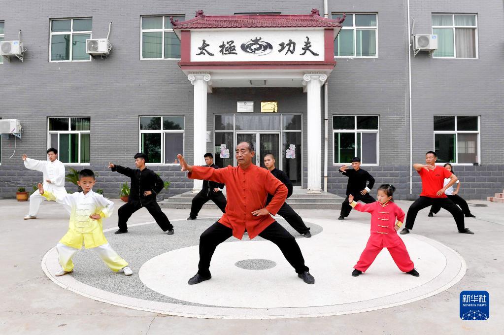 這是在河南省焦作市溫縣陳家溝一個家庭拳館內,一名拳師帶領學員們習練太極拳(2018年6月29日攝)