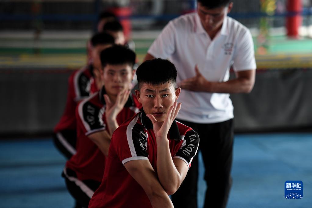 這是河南嵩山少林塔溝武校的學生在李迎港的指導下上課(2022年7月6日攝)。