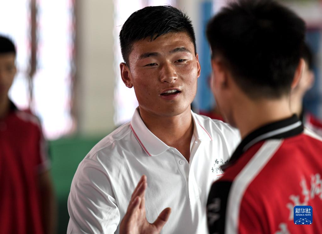 這是李迎港(左)在河南嵩山少林塔溝武校內給學生上課(2022年7月6日攝)。