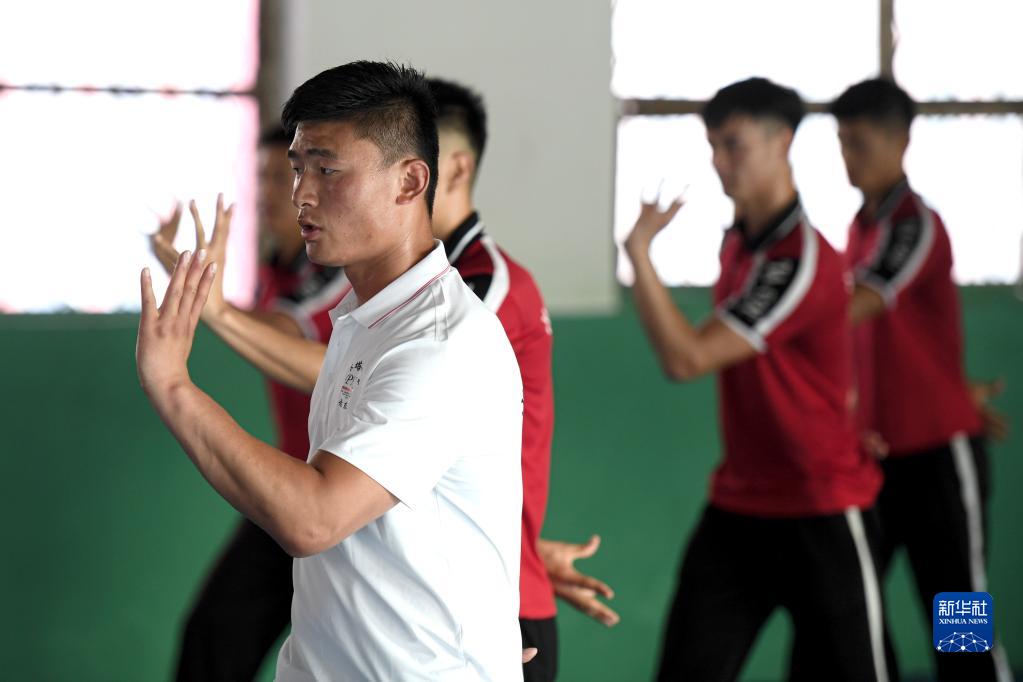 這是李迎港(前)在河南嵩山少林塔溝武校內給學生上課(2022年7月6日攝)。