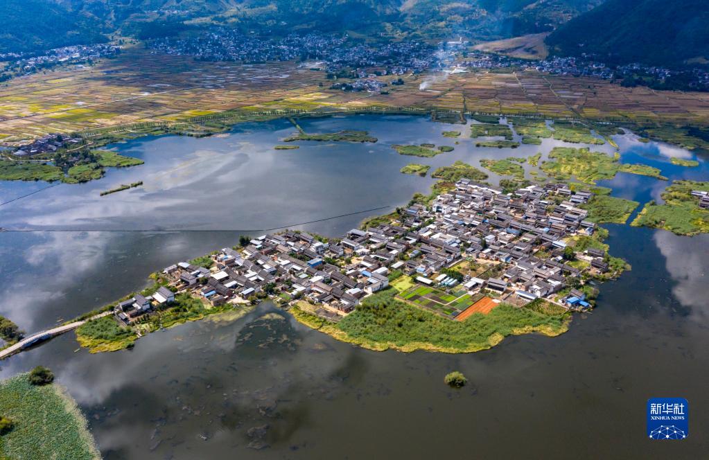這是9月28日拍攝的洱源西湖島上的村落景觀(無人機照片)。