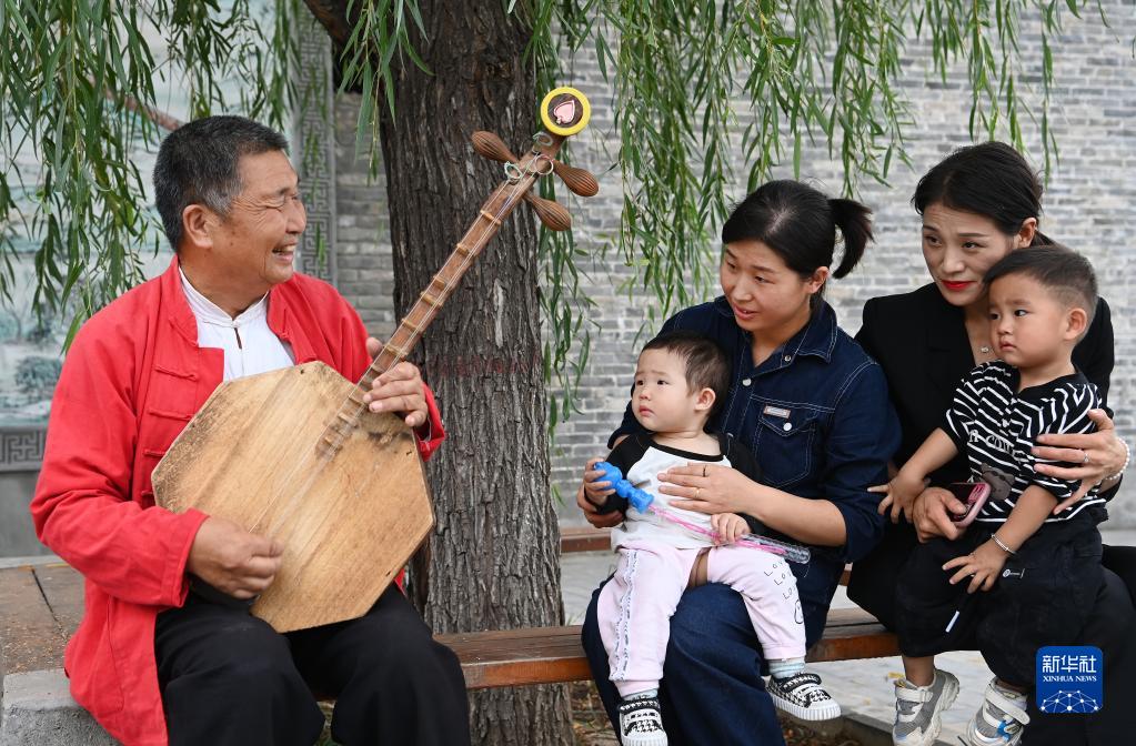 西北綜勘黃河老腔藝術團主唱薛銀照(左一)在黃河岸邊向游人介紹“黃河老腔”知識(9月26日攝)。