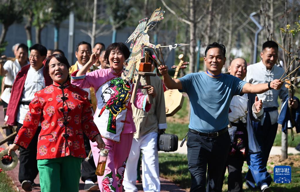 西北綜勘黃河老腔藝術團藝人在潼關縣明德公園表演后,慶祝演出成功(9月26日攝)。