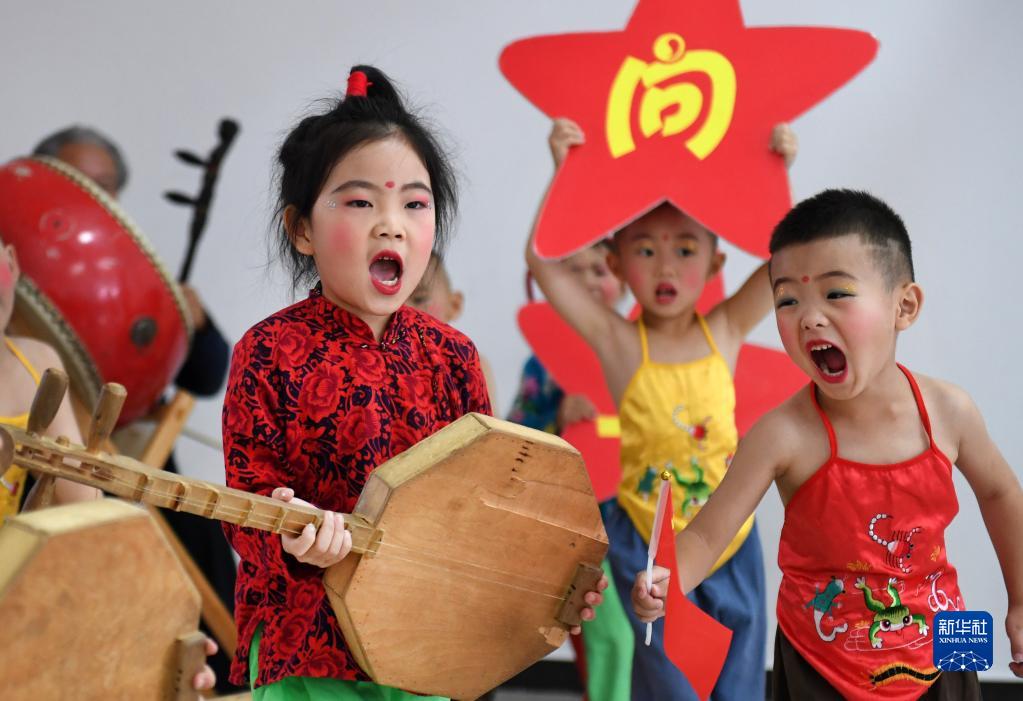 潼關縣城關北區幼兒園的孩子們表演“黃河老腔”(9月27日攝)。
