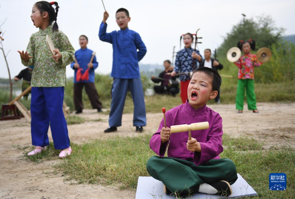 潼關縣秦東鎮濱河小學學生在黃河岸邊練習“黃河老腔”(9月27日攝)。