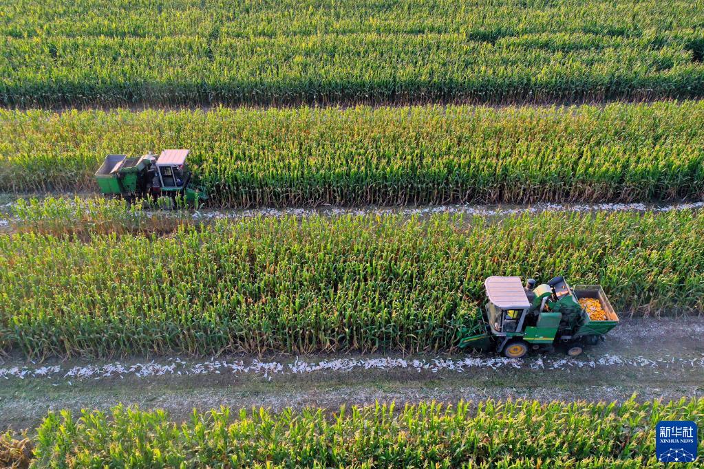 當日,山東德州樂陵市“噸半糧”核心區玉米開始收割,農戶運用大馬力收割機、翻耕機等現代化農機裝備進行勞作,田間地頭一派繁忙秋收景象。