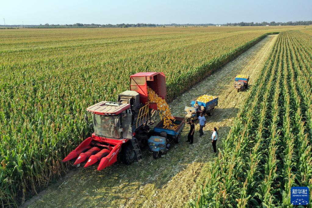 當日,山東德州樂陵市“噸半糧”核心區玉米開始收割,農戶運用大馬力收割機、翻耕機等現代化農機裝備進行勞作,田間地頭一派繁忙秋收景象。