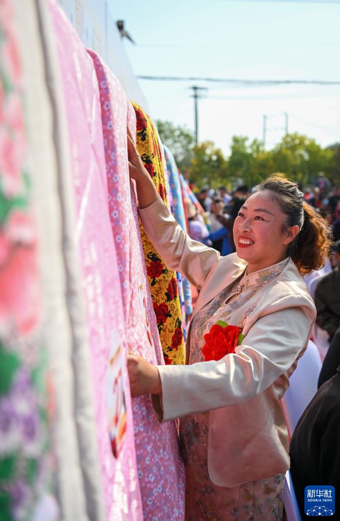 9月28日,在天津市薊州區羅莊子鎮楊家峪村,村民在重陽節“曬被子”活動中整理被子。