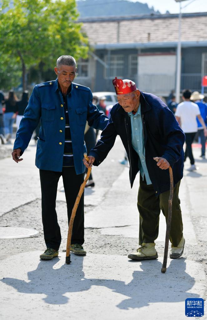 9月28日,在天津市薊州區羅莊子鎮楊家峪村,一名村民在活動結束后攙扶98歲的父親回家。