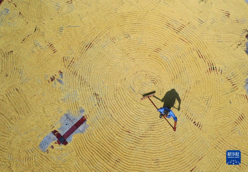 9月29日,貴州省福泉市牛場鎮村民在晾曬稻谷(無人機照片)。