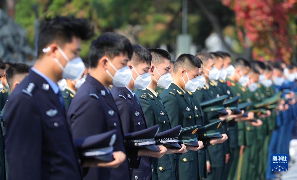 9月30日,在沈陽抗美援朝烈士陵園紀念碑廣場,參加烈士紀念日活動的人們默哀。