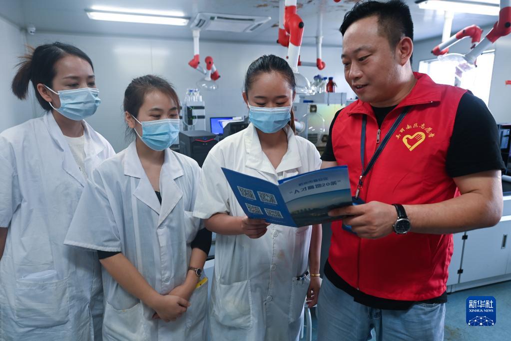9月30日,在位于杭州市臨安區錦南街道的杭州華東中藥飲片有限公司,街道人才專員(右一)將臨安區人才政策手冊送到企業員工手中,方便她們及時了解最新的人才政策。