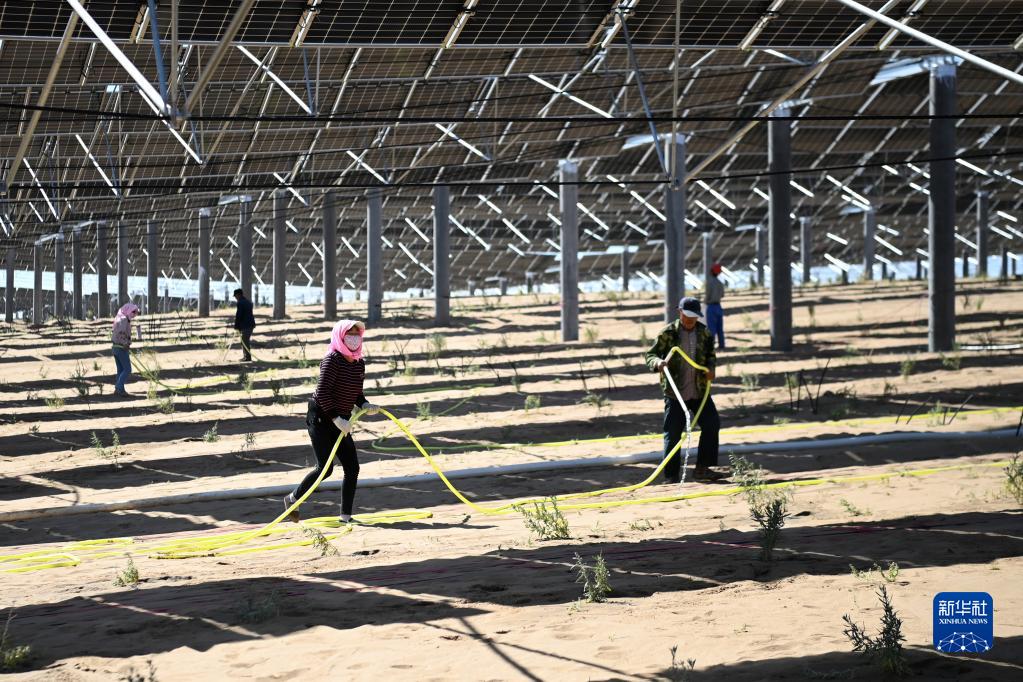 9月29日,在位于甘肅省武威市涼州區的甘肅武威50萬千瓦立體光伏治沙產業化示范項目建設現場,工人給光伏板下的沙生植物澆水。