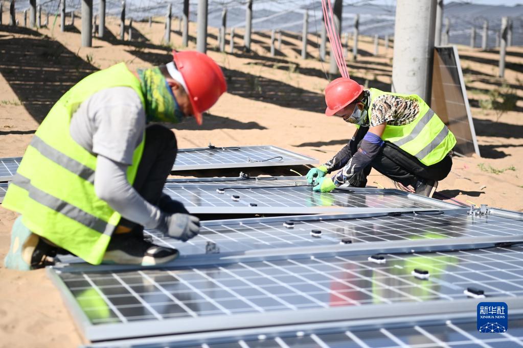 9月29日,在位于甘肅省武威市涼州區的甘肅武威50萬千瓦立體光伏治沙產業化示范項目建設現場,施工人員在安裝光伏板掛件。