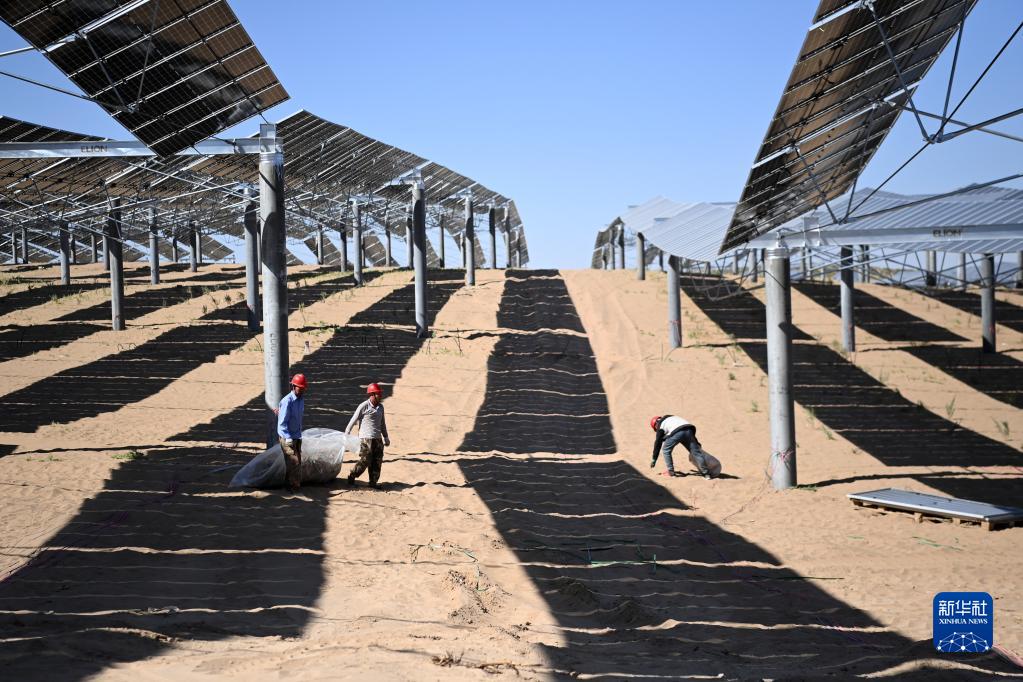 作為我國以沙漠、戈壁、荒漠地區為重點的大型風電光伏基地項目,甘肅武威50萬千瓦立體光伏治沙產業化示范項目自啟動建設以來,將太陽能開發與騰格里沙漠治理有機結合,在建設光伏電站的同時,在光伏板下栽植沙生植物,既能起到防風固沙的作用,也為下一步發展板下農牧業奠定基礎。目前,該項目建設已接近尾聲,預計今年年底建成并網發電。