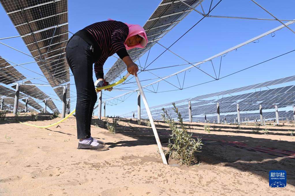 9月29日,在位于甘肅省武威市涼州區的甘肅武威50萬千瓦立體光伏治沙產業化示范項目建設現場,工人給光伏板下沙生植物澆水。