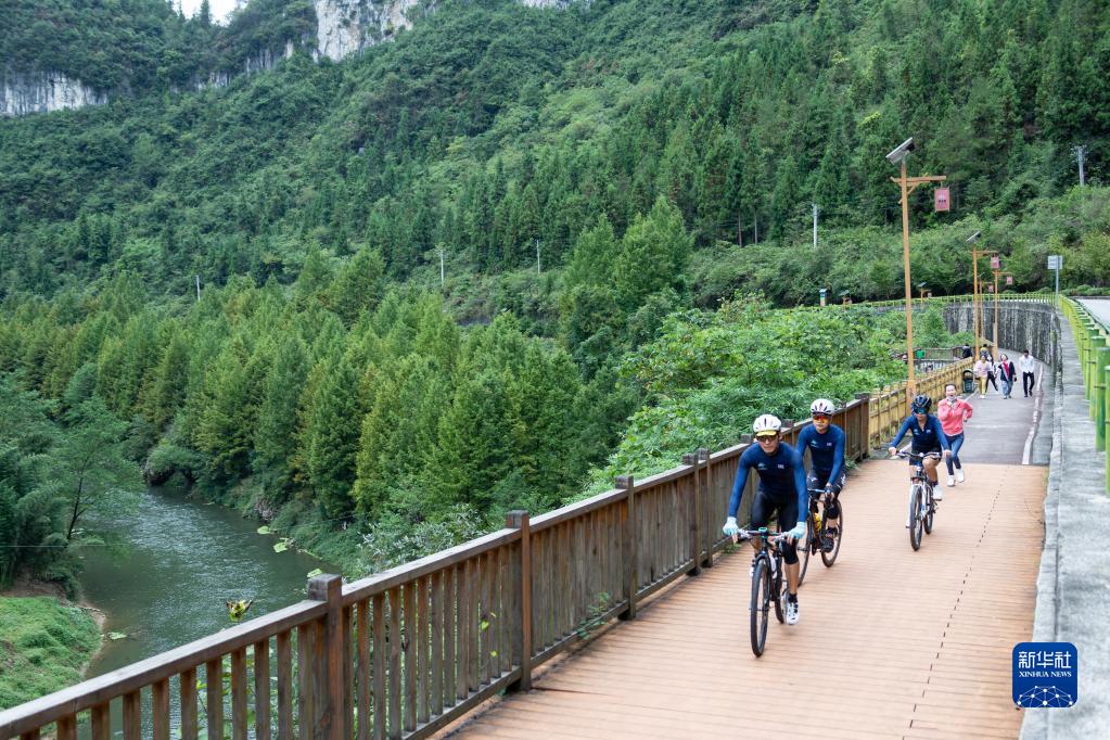 2022年9月25日,人們在湖北省利川市境內的長江支流清江邊騎行。