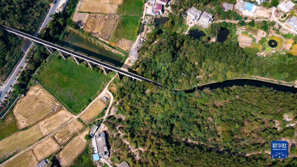 湖北白蓮河水庫的庫水經東干渠流向黃岡市浠水縣和蘄春縣(無人機照片,2022年9月27日攝)。