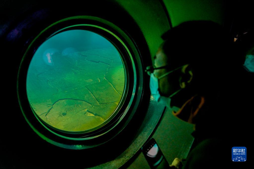 游客在重慶白鶴梁水下博物館的水下參觀廊道內,通過觀景窗觀看保護罩內的白鶴梁題刻(2021年2月21日攝)。