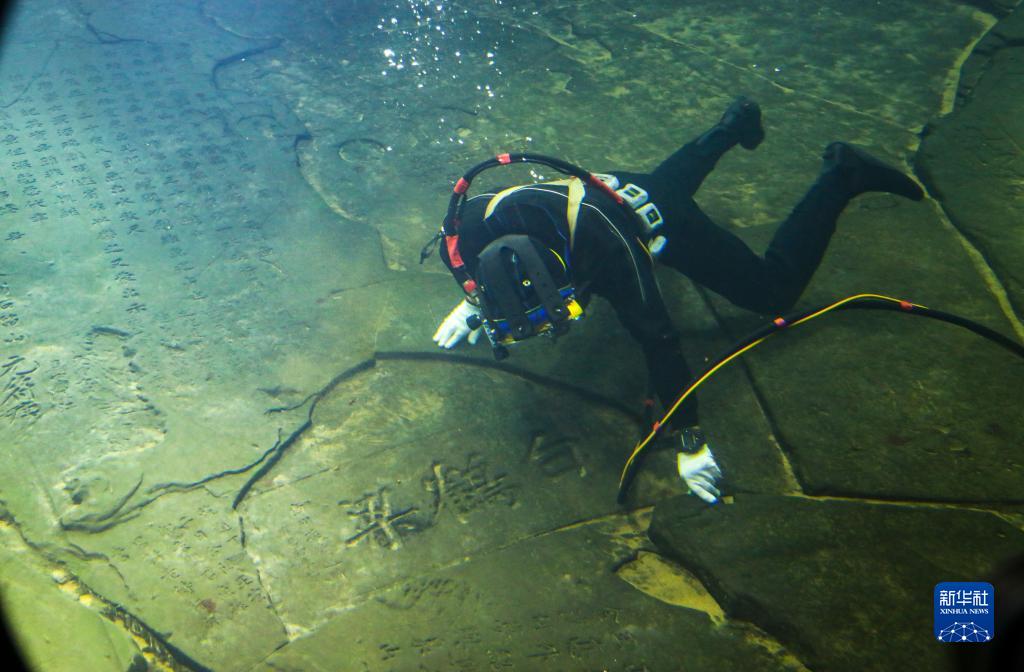 在重慶白鶴梁水下博物館的白鶴梁題刻無壓容器罩內,潛水員在進行清理作業(2021年3月15日攝)。