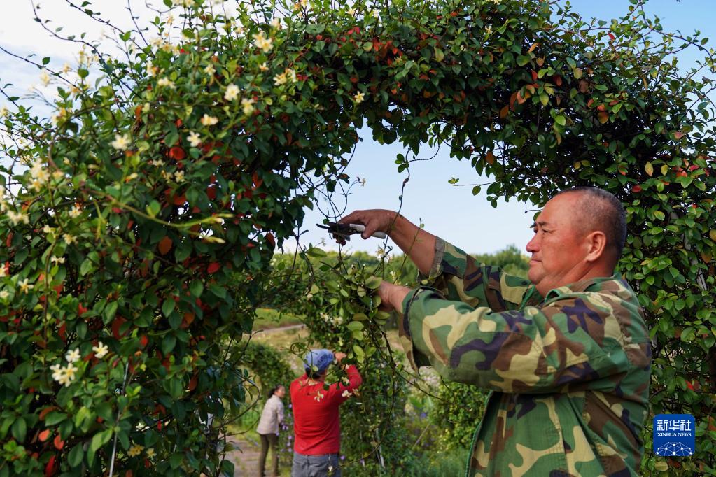 2022年9月28日,在四川瀘州納溪區大渡口鎮,工人在長江支流清溪河岸邊綠地修剪植物。