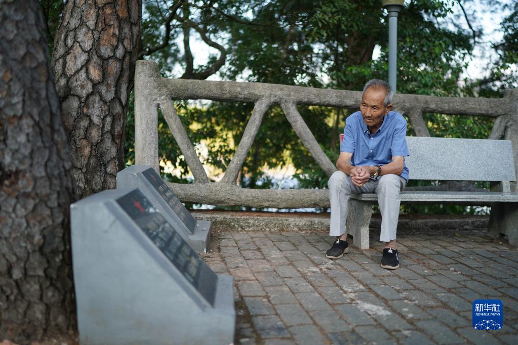 9月16日,紅軍烈士華欽材的后代華從祁坐在松樹下與松樹“說話”。