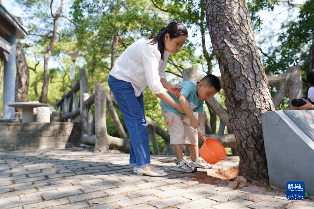9月17日,華屋村村民為松樹澆水。