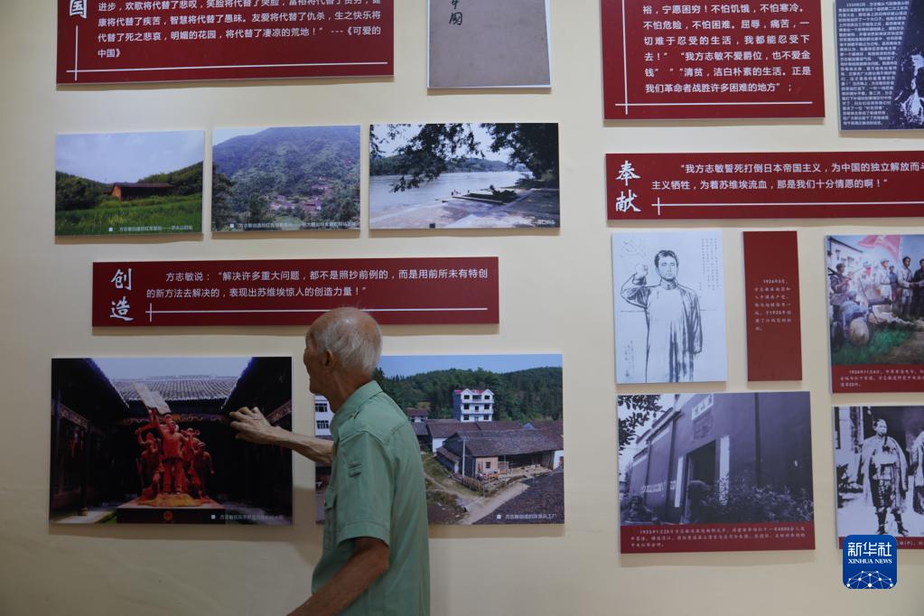 9月23日,程樟柱在紀念館里撫摸著展板墻。