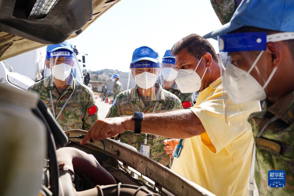 9月26日,在位于黎巴嫩南部辛尼亞村的中國維和部隊營區,聯合國駐黎巴嫩臨時部隊司令部派出的核查組官員檢查車輛發動機。