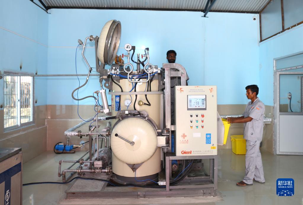 9月29日,在尼泊爾南部比爾甘杰市,納拉亞尼醫院的工作人員操作中國援助的醫療垃圾處理設備。新華社發(哈里·馬哈爾詹攝)