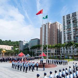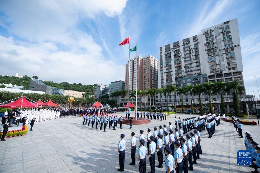 10月1日,澳門特別行政區政府在金蓮花廣場舉行升旗儀式,慶祝中華人民共和國成立73周年。新華社記者 張金加 攝