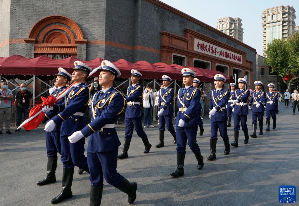 10月1日,在上海中共一大會址舉行的升旗儀式上,“一大廣場國旗護衛隊”護衛國旗入場。