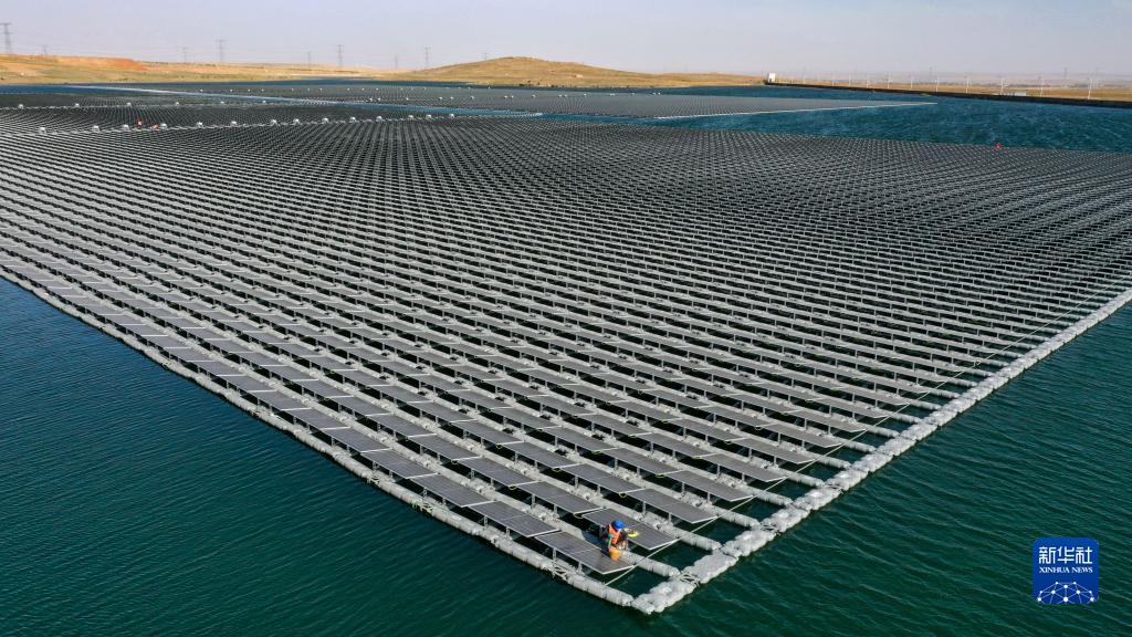 這是位于寧夏靈武市的國家能源集團寧夏電力公司寧東電廠3×5.98兆瓦漂浮分布式光伏發電項目(6月17日攝,無人機照片)。