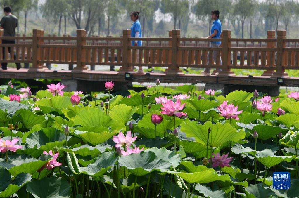 6月21日,在山東省曹縣黃河故道國家濕地公園,游客觀賞荷花。