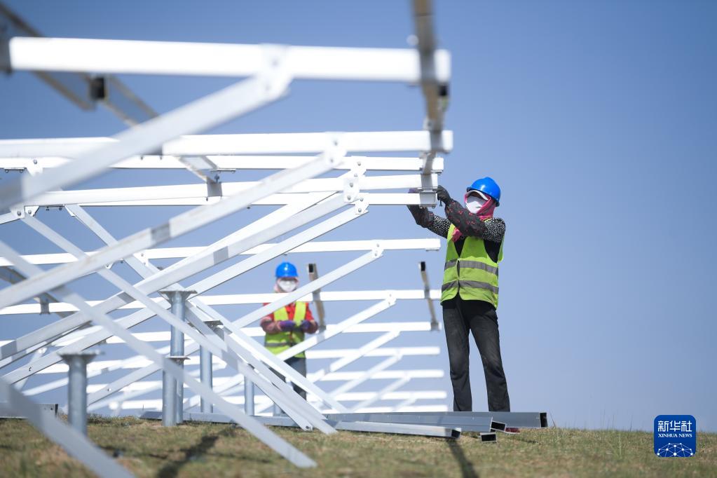 6月8日,在青海省海南藏族自治州共和縣,工人在黃河上游水電開發有限責任公司海南基地共和縣100萬千瓦光伏項目施工。