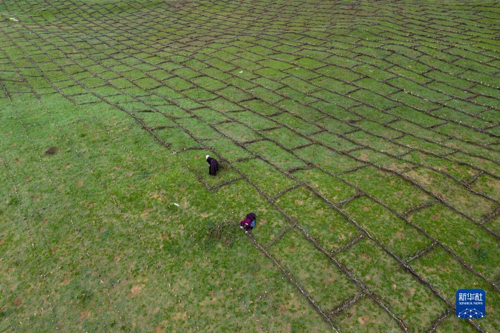 在四川省若爾蓋縣麥溪鄉黑河村,當地藏族群眾在用高原柳編織沙障(2022年7月25日攝,無人機照片)。