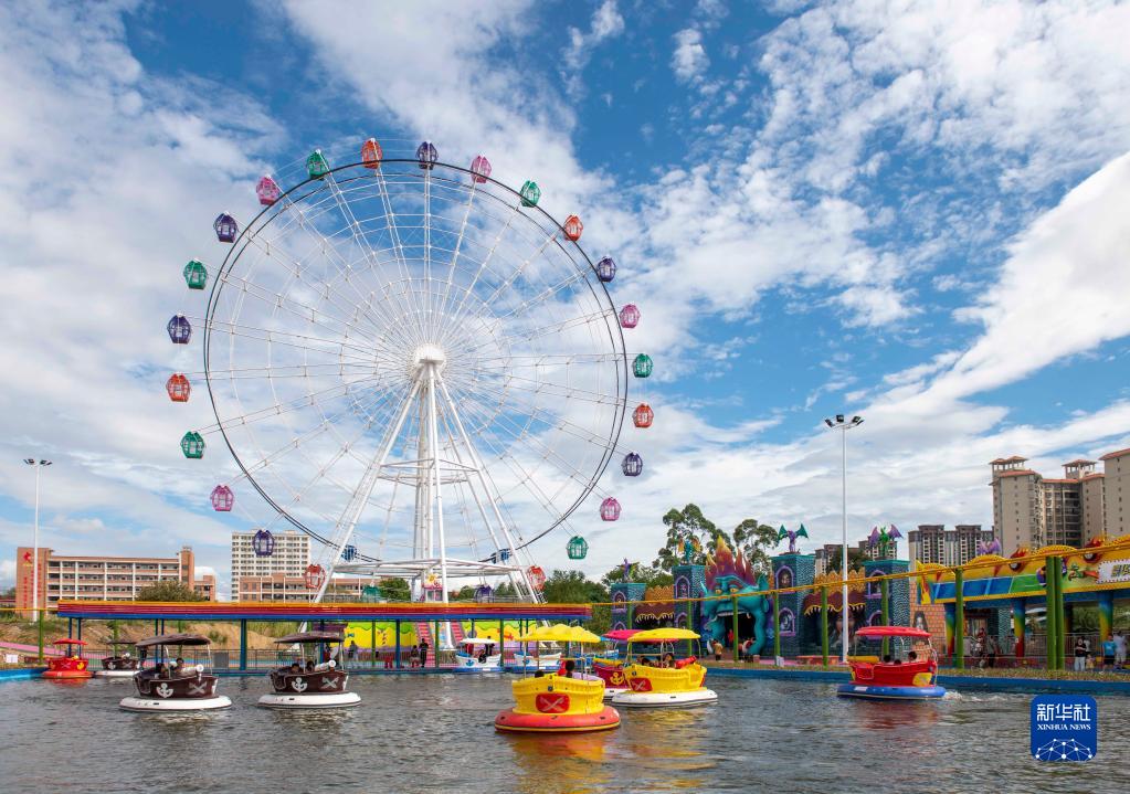 10月1日,市民在湖南省永州市道縣一游樂場坐碰碰船。