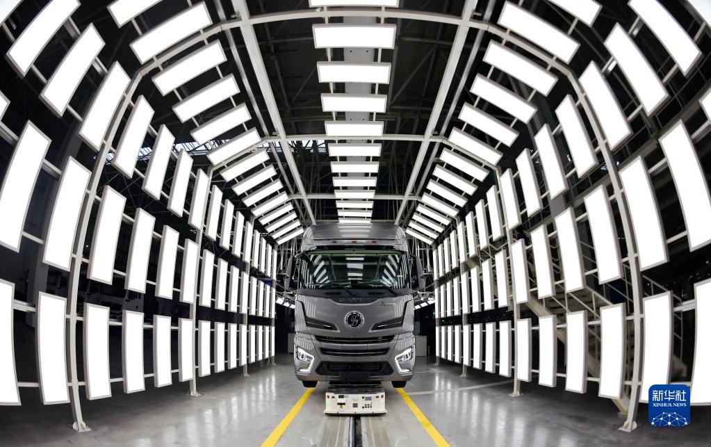 一輛重卡在陜汽重卡擴能項目汽車總裝生產線進行下線檢測(9月27日攝)。