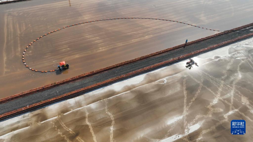 9月27日,工人在唐山海港經濟開發區長蘆大清河鹽場收獲秋鹽(無人機照片)。