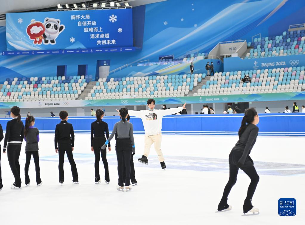 10月1日,在“冰絲帶”內,教練為參加花樣滑冰培訓的青少年講解要點。
