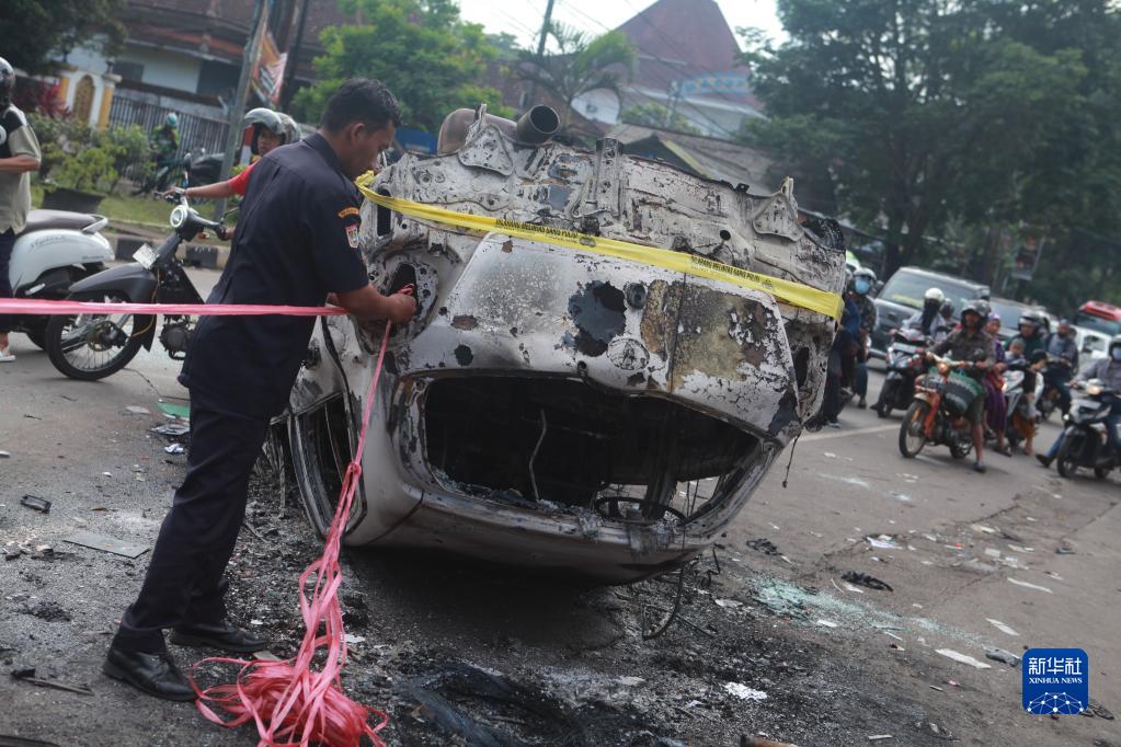 10月2日,在印度尼西亞東爪哇省瑪瑯市,警方人員在事發球場外為被焚毀的車輛系上繩子。