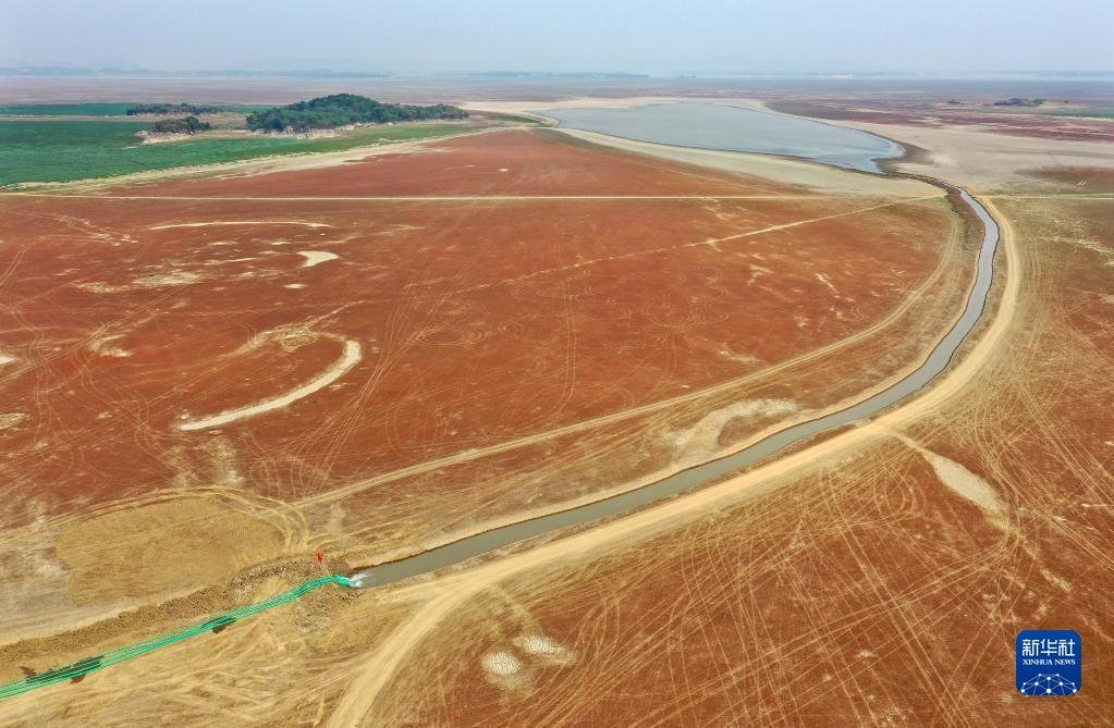 在江西省都昌縣,鄱陽湖主航道的水通過水泵抽水與人工水渠的接力,輸入朱袍山區域的碟形湖中(9月28日攝,無人機照片)。