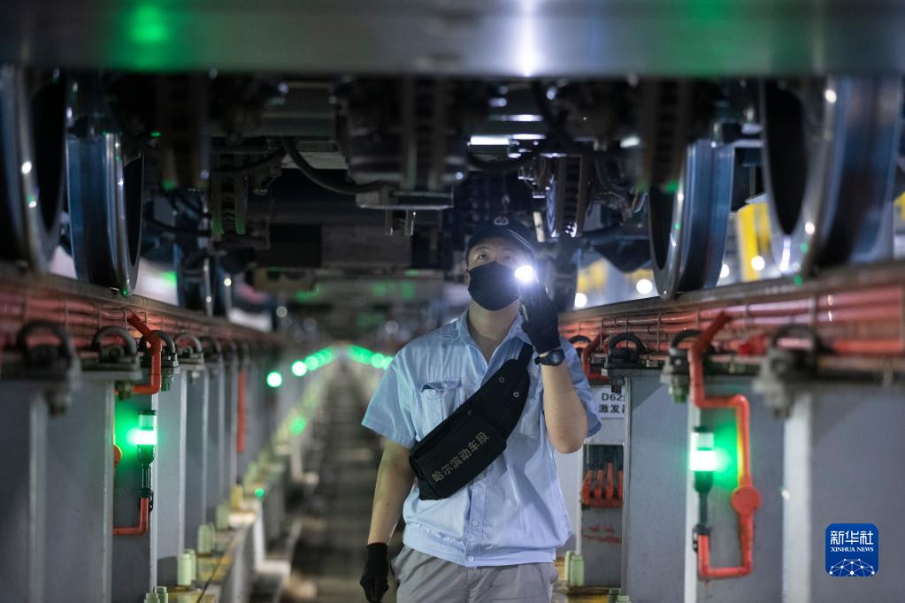 10月1日晚,在中國鐵路哈爾濱局集團有限公司哈爾濱動車段檢修車間內,動車組地勤機械師龔雨茁在進行檢修作業。