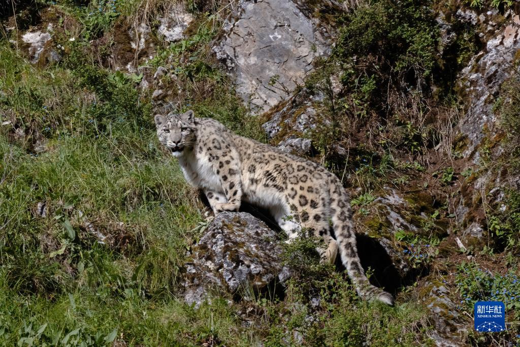 這是在青海省玉樹藏族自治州雜多縣境內的昂賽大峽谷拍攝的雪豹(8月6日攝)。