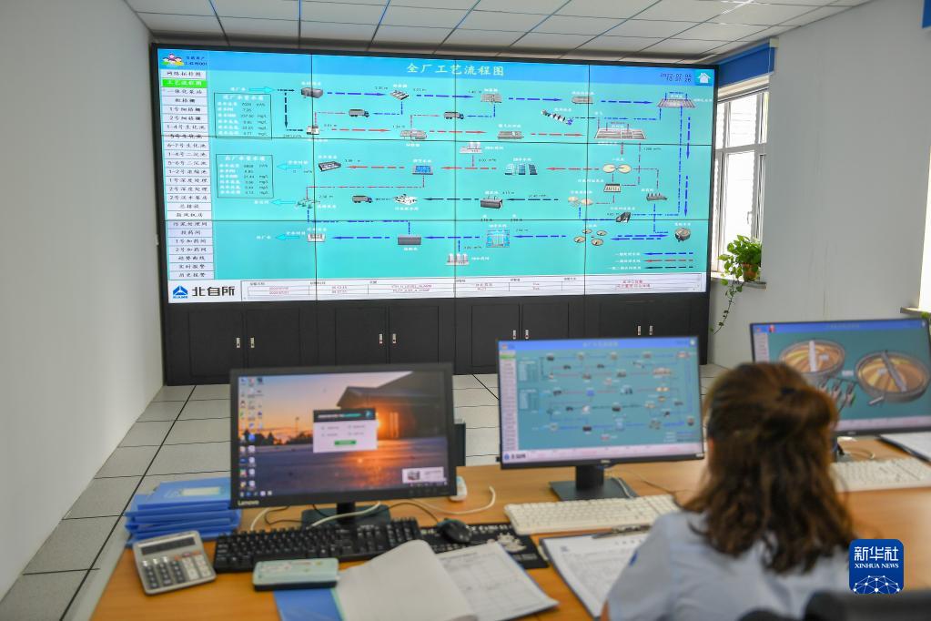 在吉林省遼源市中核遼源環??萍加邢薰?,工作人員監控污水處理設備狀態(2022年7月5日攝)。