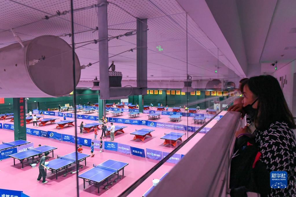 一位家長在成都市全國重點乒乓球運動學校觀看孩子訓練(9月29日攝)。