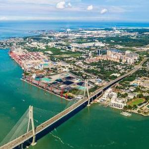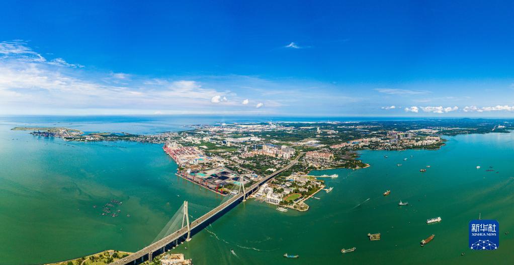 10月2日在海南儋州拍攝的洋浦大橋對岸的海南洋浦經濟開發區(無人機全景照片)。