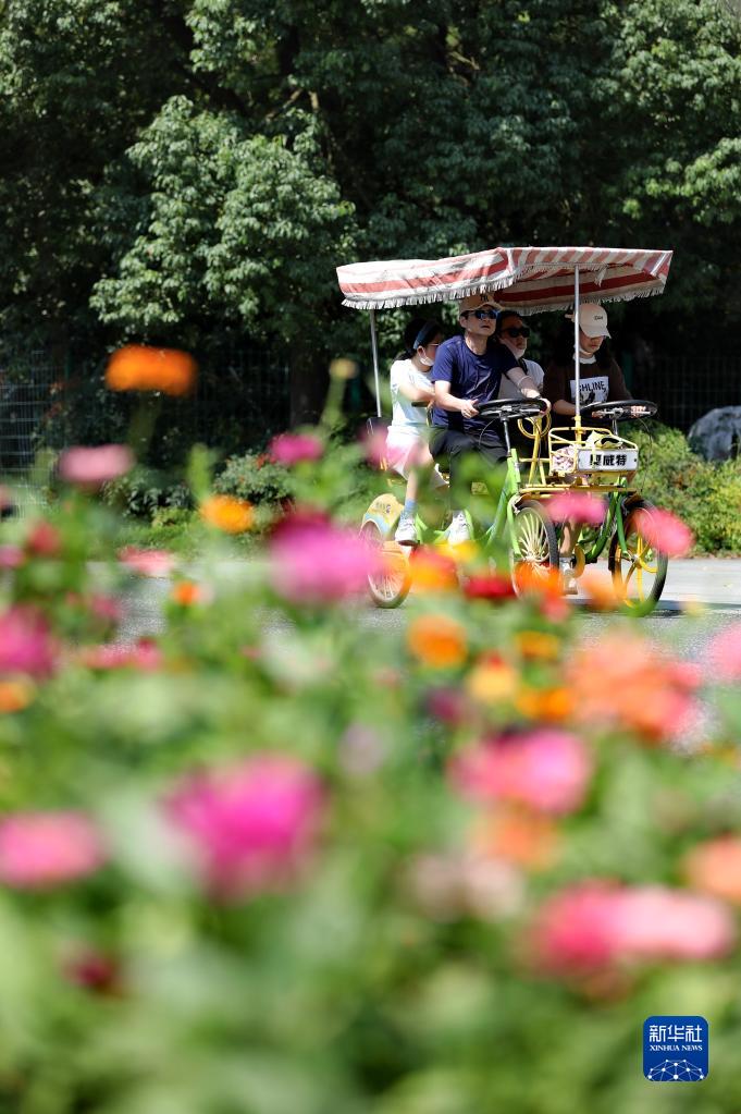 10月2日,市民在浙江省嘉興市植物園騎行。