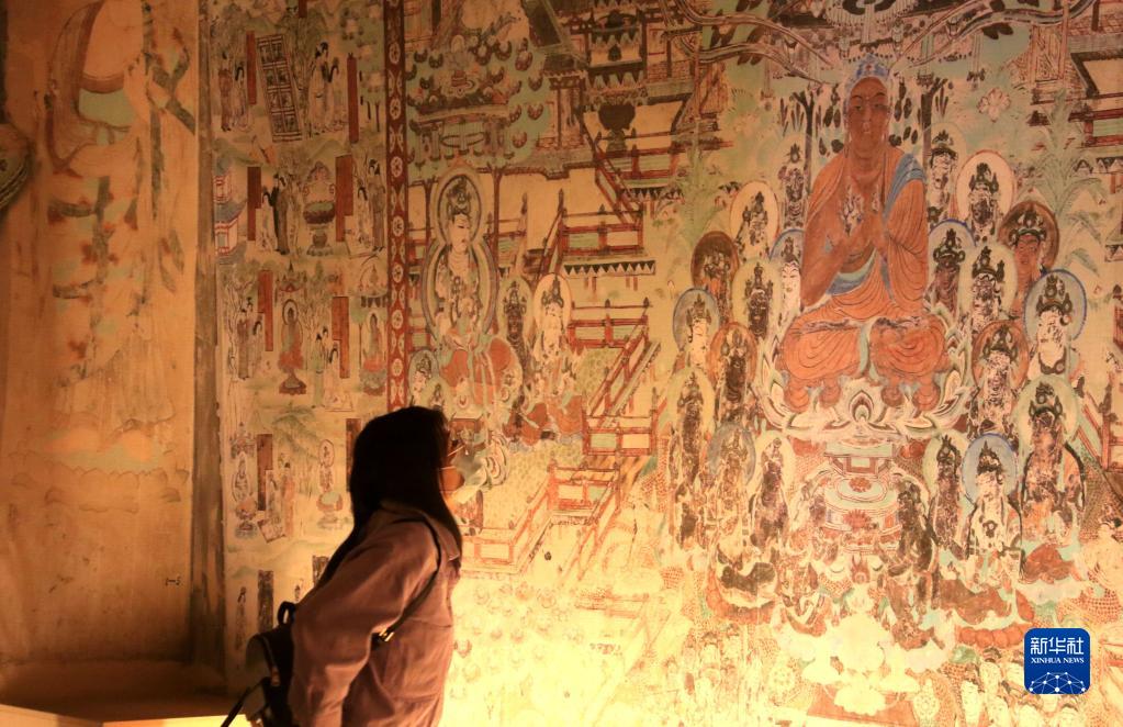 10月2日,游客在甘肅省敦煌市博物館參觀文物展。