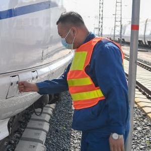 10月2日,在長春動車運用所,技術人員朱磊檢查列車設備。